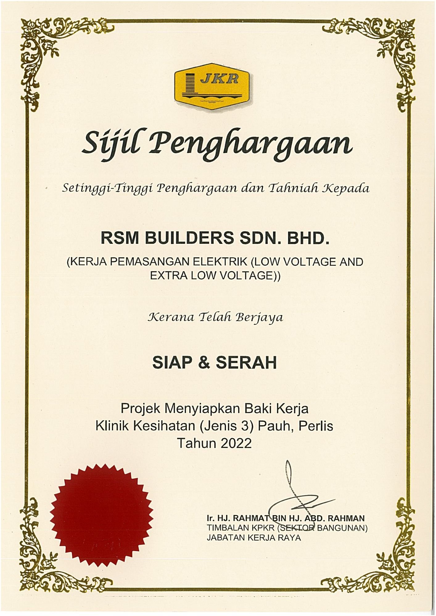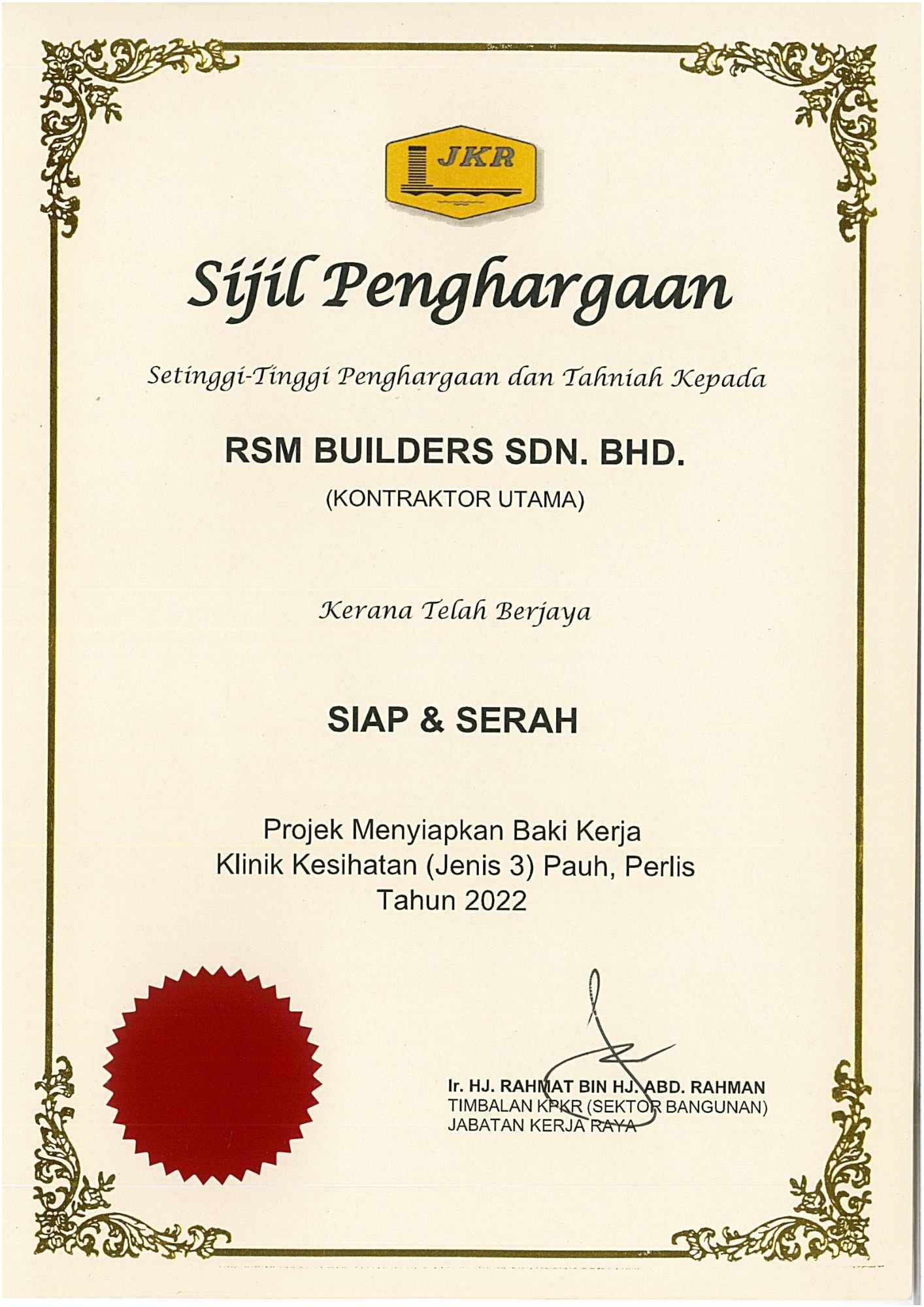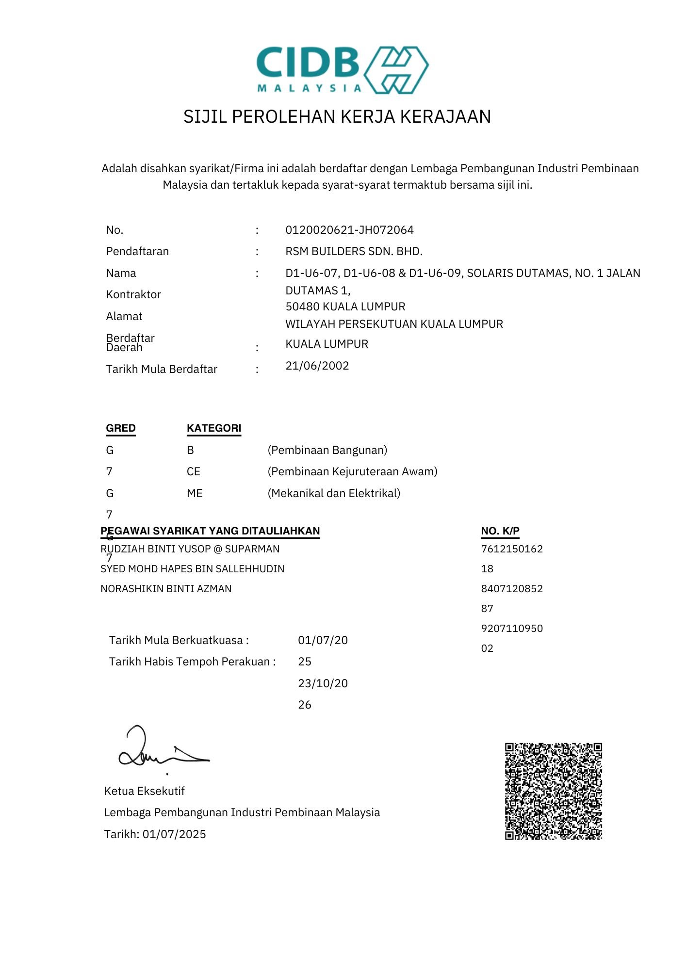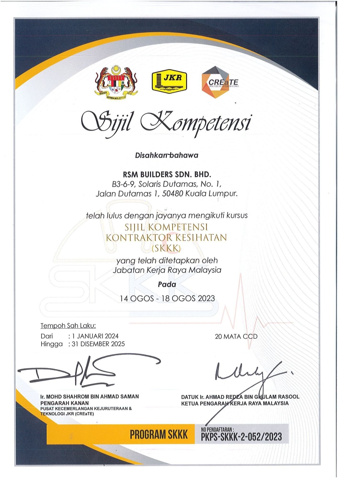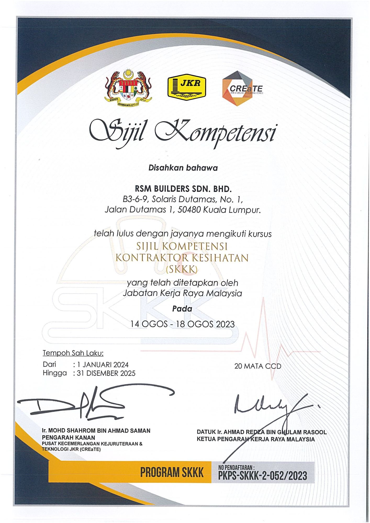 RSM Builders Sdn Bhd is a CIDB-registered contractor recognized for our professionalism and compliance with industry standards. Our company holds various licenses, vendor registrations, and certifications, enabling us to participate in high-value government and private projects. These recognitions serve as proof of our credibility, governance, and excellence in delivery. We continue to pursue certifications that strengthen our competitiveness and ensure that our projects meet local and international standards.