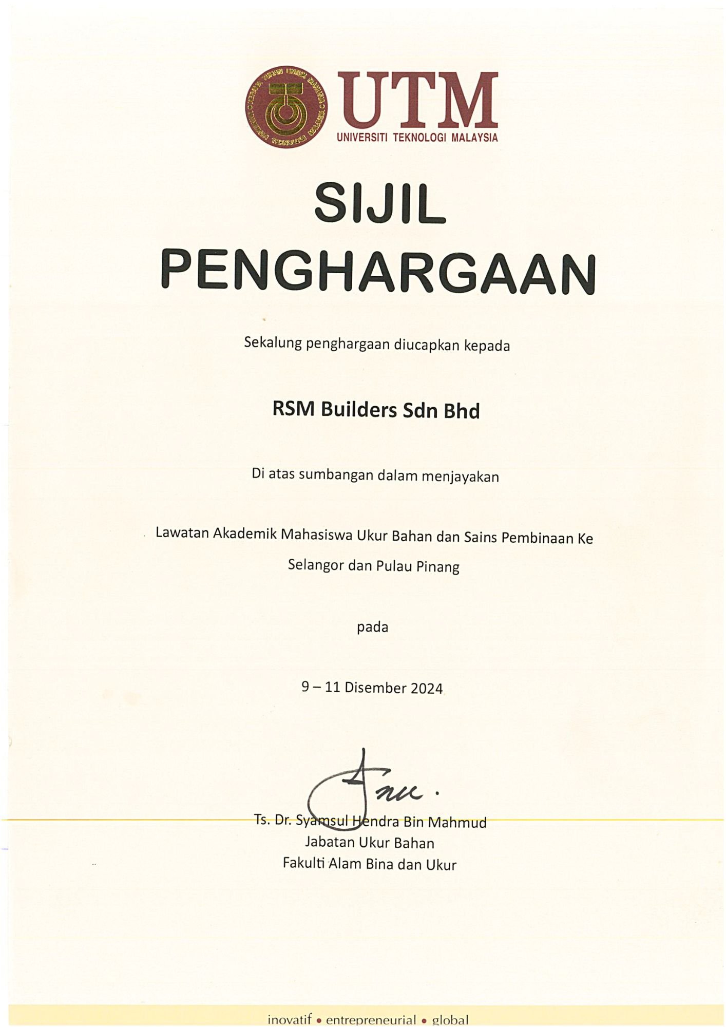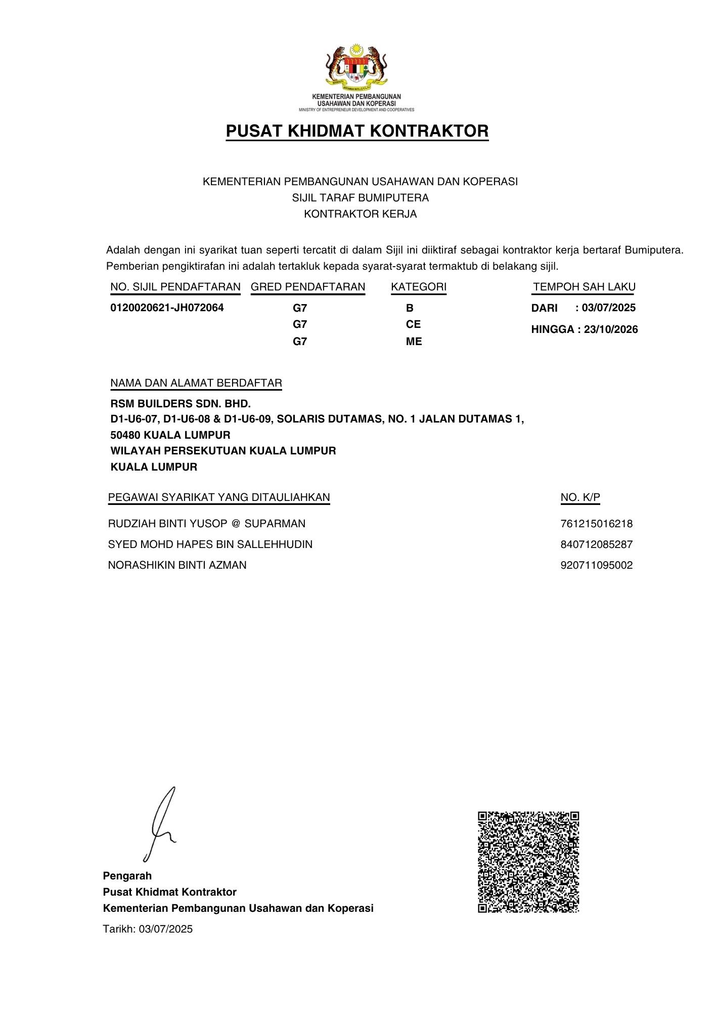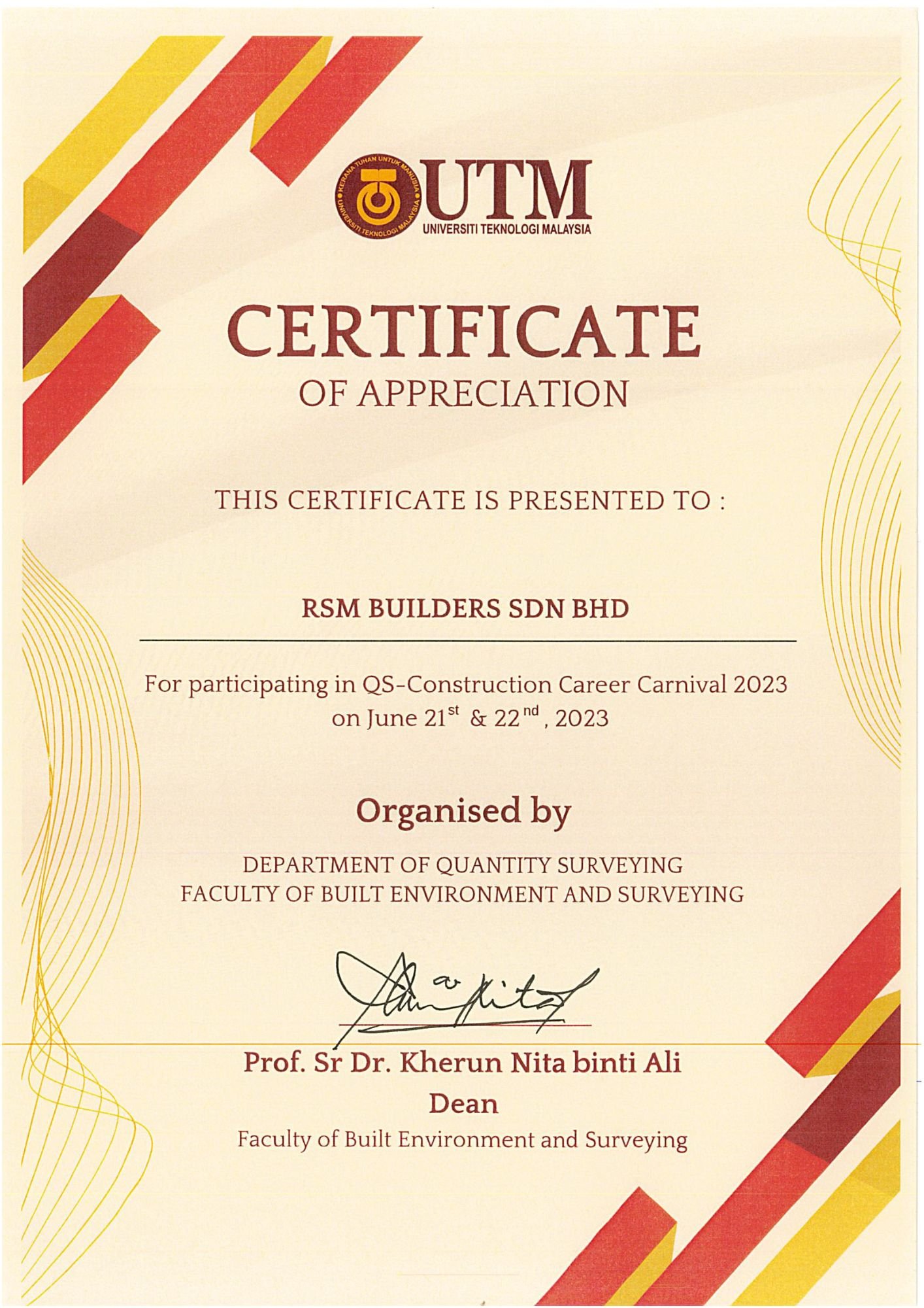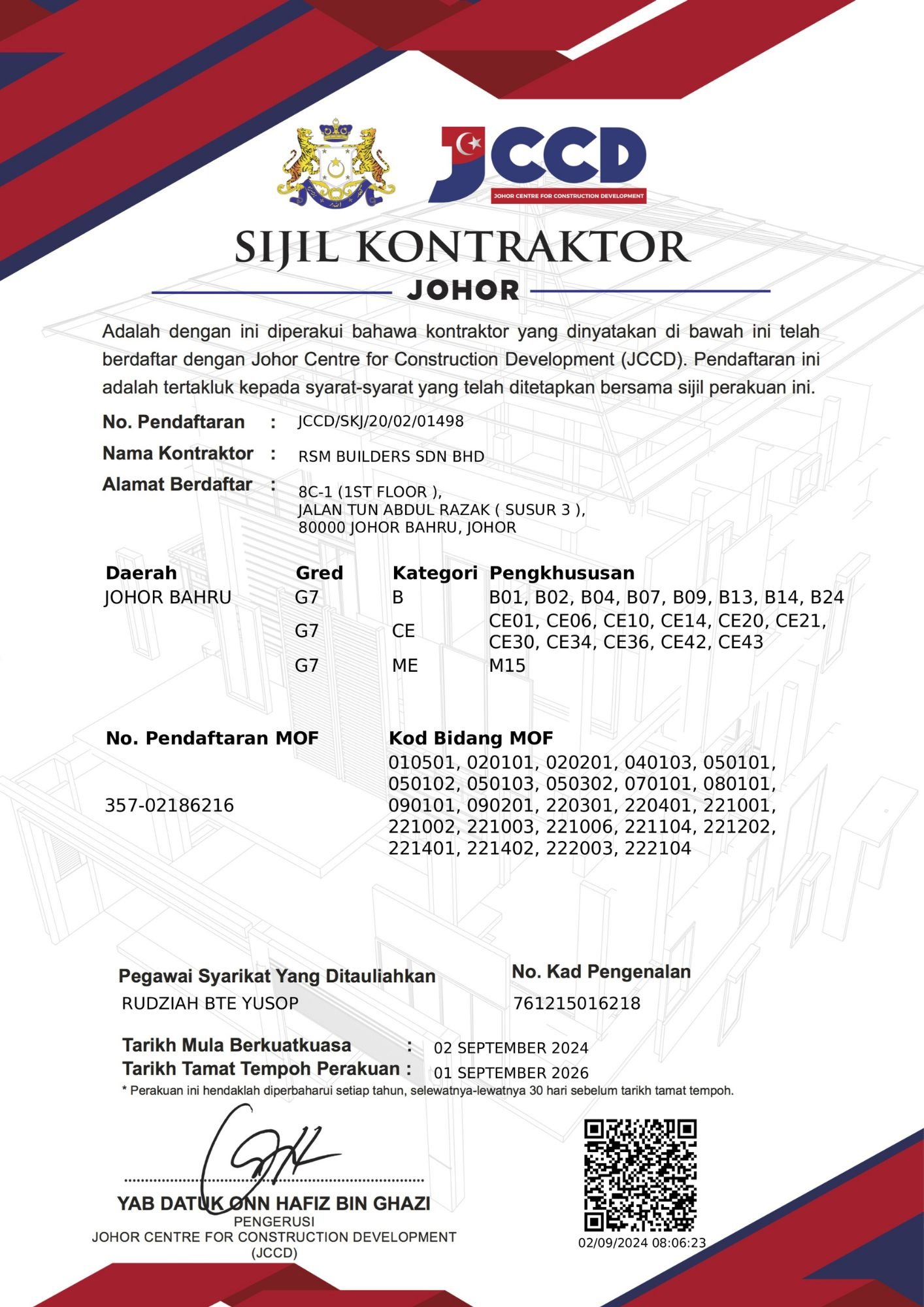 RSM Builders Sdn Bhd is a CIDB-registered contractor recognized for our professionalism and compliance with industry standards. Our company holds various licenses, vendor registrations, and certifications, enabling us to participate in high-value government and private projects. These recognitions serve as proof of our credibility, governance, and excellence in delivery. We continue to pursue certifications that strengthen our competitiveness and ensure that our projects meet local and international standards.